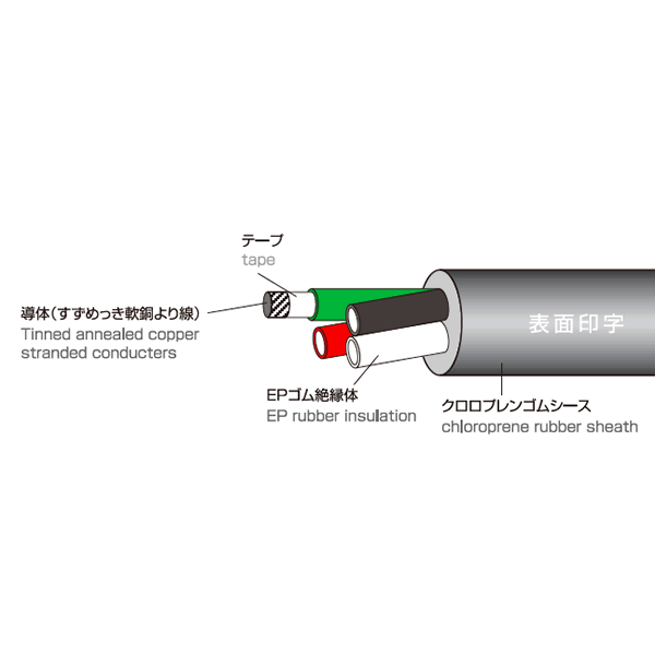 2種EPゴム絶縁クロロプレンキャブタイヤケーブル 0.75sq 600V耐圧(<PSE>、JIS C 3152、JIS C3005の4.26.2のa)切り売り 1m〜柔軟性クロロプレンシース材料を使用し、耐油性、耐候性、耐熱性に優れています。